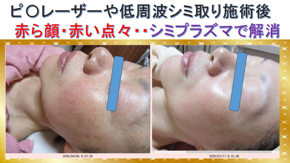 ピ〇レーザーや低周波シミ取り施術後   赤い顔・赤い点々・・・シミプラズマで解消